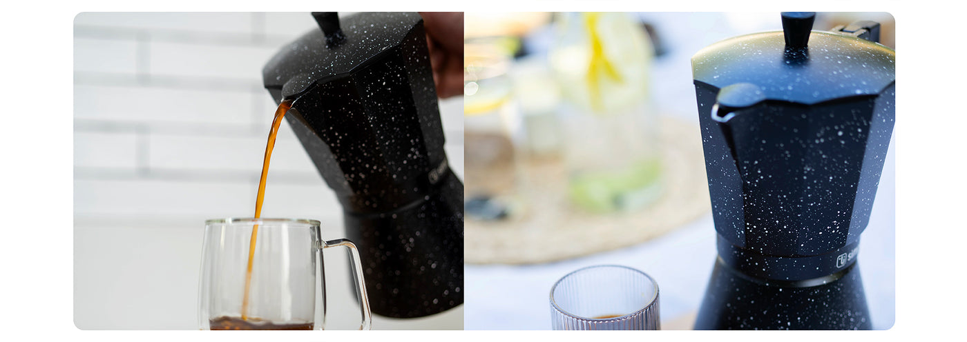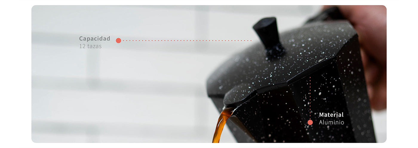 Haz del café un ritual diario con nuestra Cafetera Italiana Simplit de 12 tazas. Diseñada para los amantes del café en grandes cantidades, esta cafetera te permite disfrutar de la autenticidad y la intensidad de un café italiano en la comodidad de tu hogar. Su elegante diseño negro de granito añade un toque moderno a tu espacio culinario.