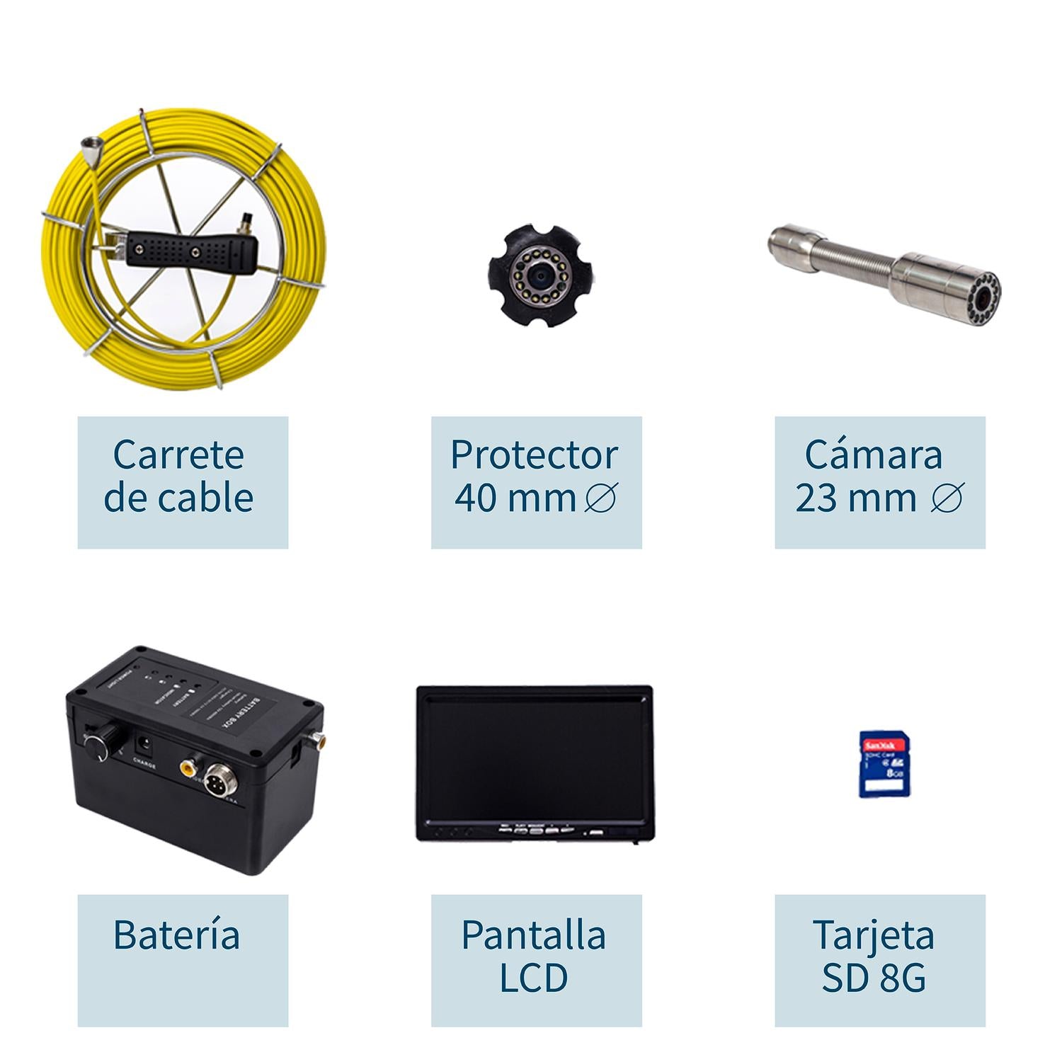 • 1x Cámara, 1x Soporte monitor, 1x línea de conexión, 1x Cable 40 metros, 1x Cargador, 1x Batería 4500 mAh, 1x Tornillo conductor, 1x Caja de aluminio