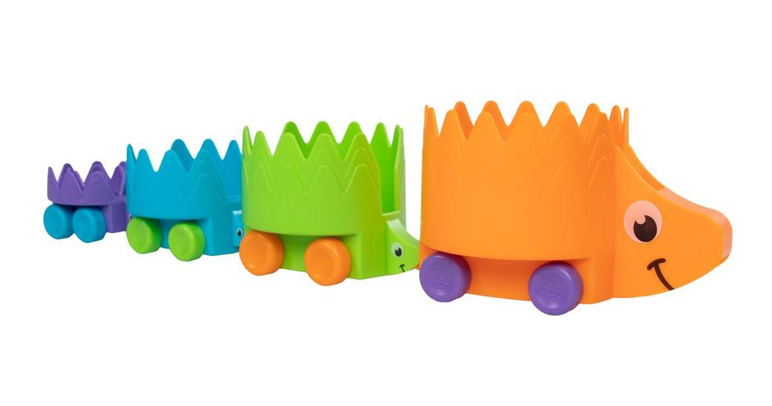 ¡Apila, conecta y deja volar tu imaginación! Set de 4 erizos apilables que se guardan de mayor a menos uno dentro de otro, también se pueden unir y hacer andar como tren. Fomenta las habilidades motoras finas, el razonamiento espacial, el aprendizaje sensorial, el aprendizaje táctil.