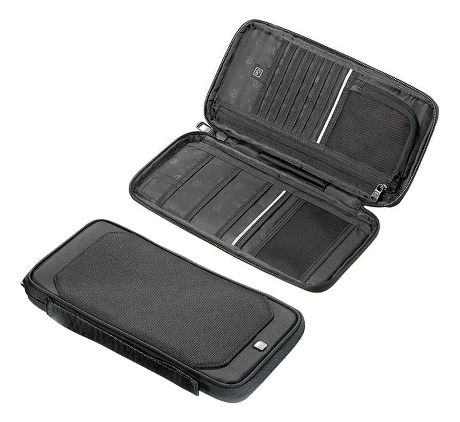 Mantén tus viajes organizados y seguros con nuestro Organizador de Documentos con Bloqueo RFID. Este práctico accesorio te ofrece protección avanzada al bloquear el escaneo no autorizado de tus tarjetas de crédito y pasaportes, gracias a su tecnología RFID integrada.