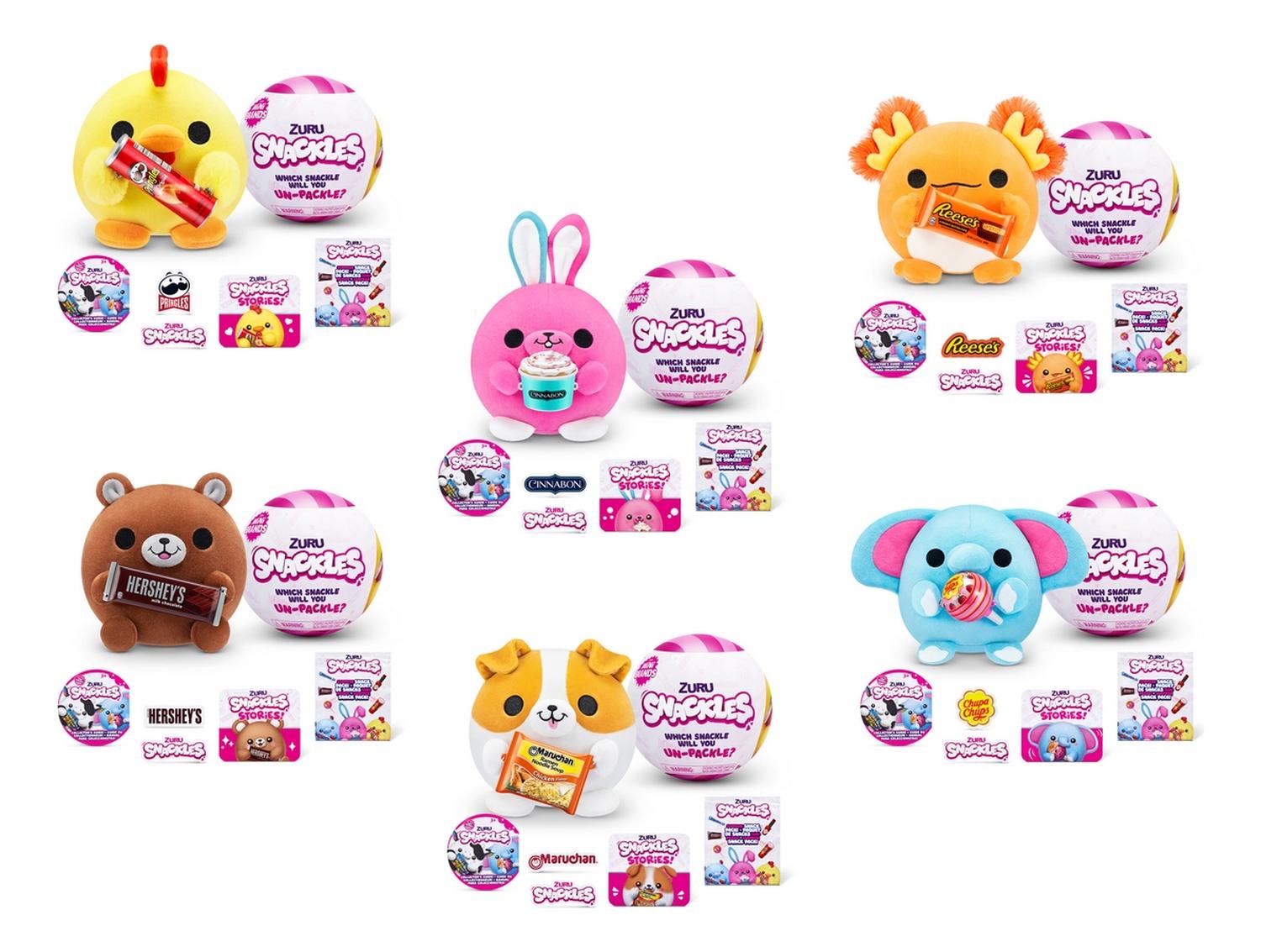 Los peluches en esfera Snackles de Zuru son el juguete perfecto para los amantes de los peluches y los coleccionistas. Estos adorables peluches de 12 cm están hechos de un material super suave y esponjoso lo que lo hace irresistible para apretar. Cada Snackles viene con un snack de una mini marca reconocida, puede ser de Mentos, Hershey´s, Reese´s, Cinnabon, Maruchan, entre otros, también incluyen un cómic de historia de origen y pegatinas, son 11 peluches para coleccionar. Estos Snackles son el regalo perfecto para cualquier ocasión, ideales para niños de todas las edades y también son una gran adicción a cualquier colección de peluches, siendo una manera divertida y creativa de disfrutar. Estas esferas debido a que son sorpresas se envían al azar por lo que los modelos y colores pueden variar de acuerdo con la disponibilidad.