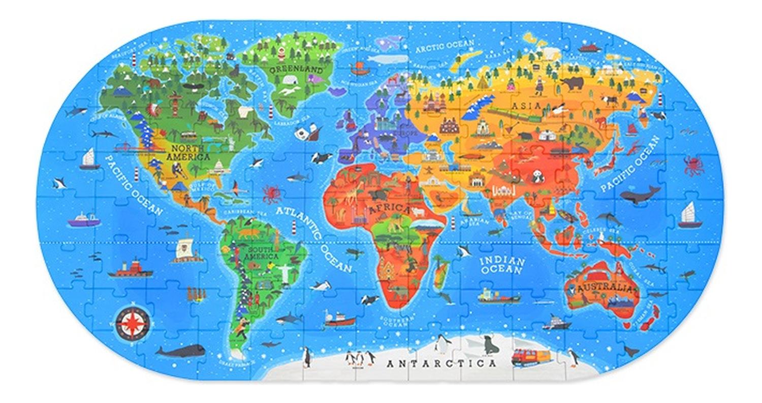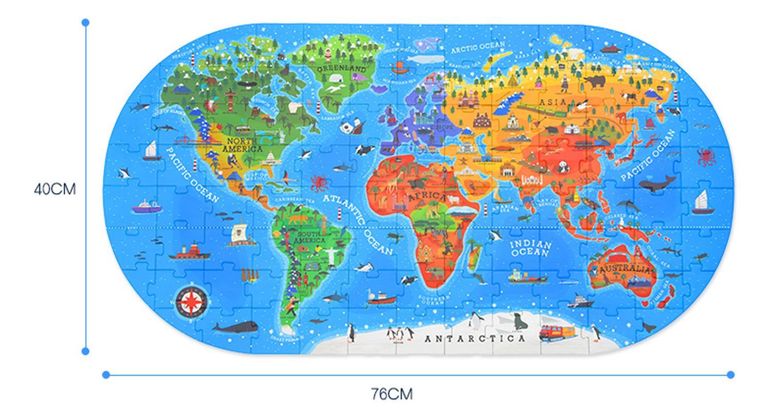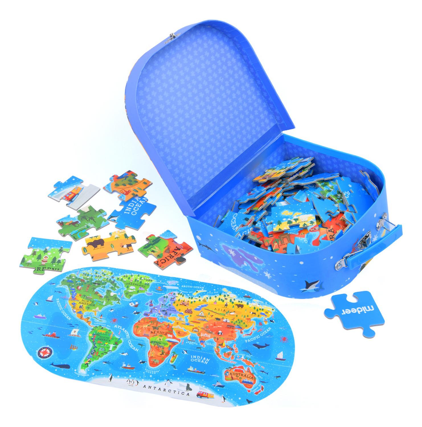 Puzzle de 100 piezas en maleta, ideal para guardar y transportar fácilmente, diseño de mundo. Promueve la concentración, el pensamiento lógico y el reconocimiento de cuentos. Incluye hoja con dibujo de referencia.