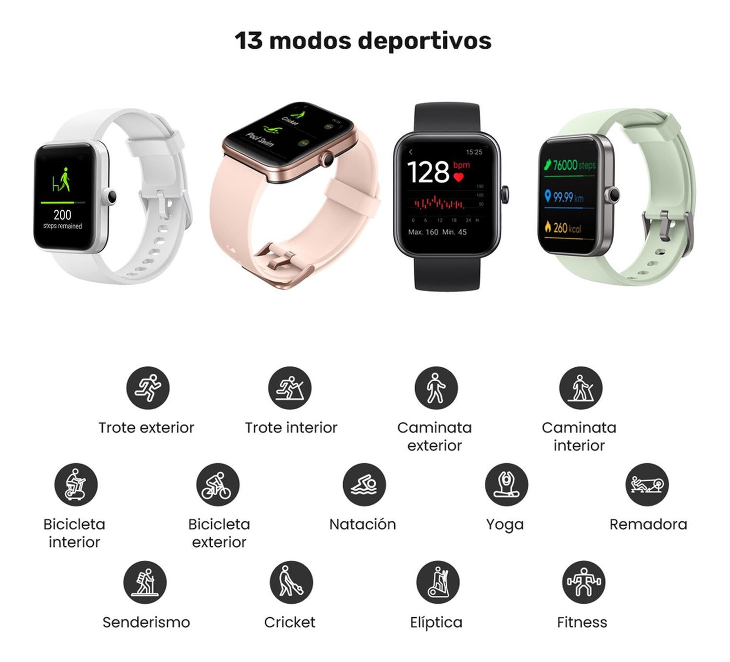 • 13 modos deportivos: trote interior y exterior, caminata interior y exterior, bicicleta interior y exterior, cricket, senderismo, natación, yoga, remadora, elíptica, fitness.