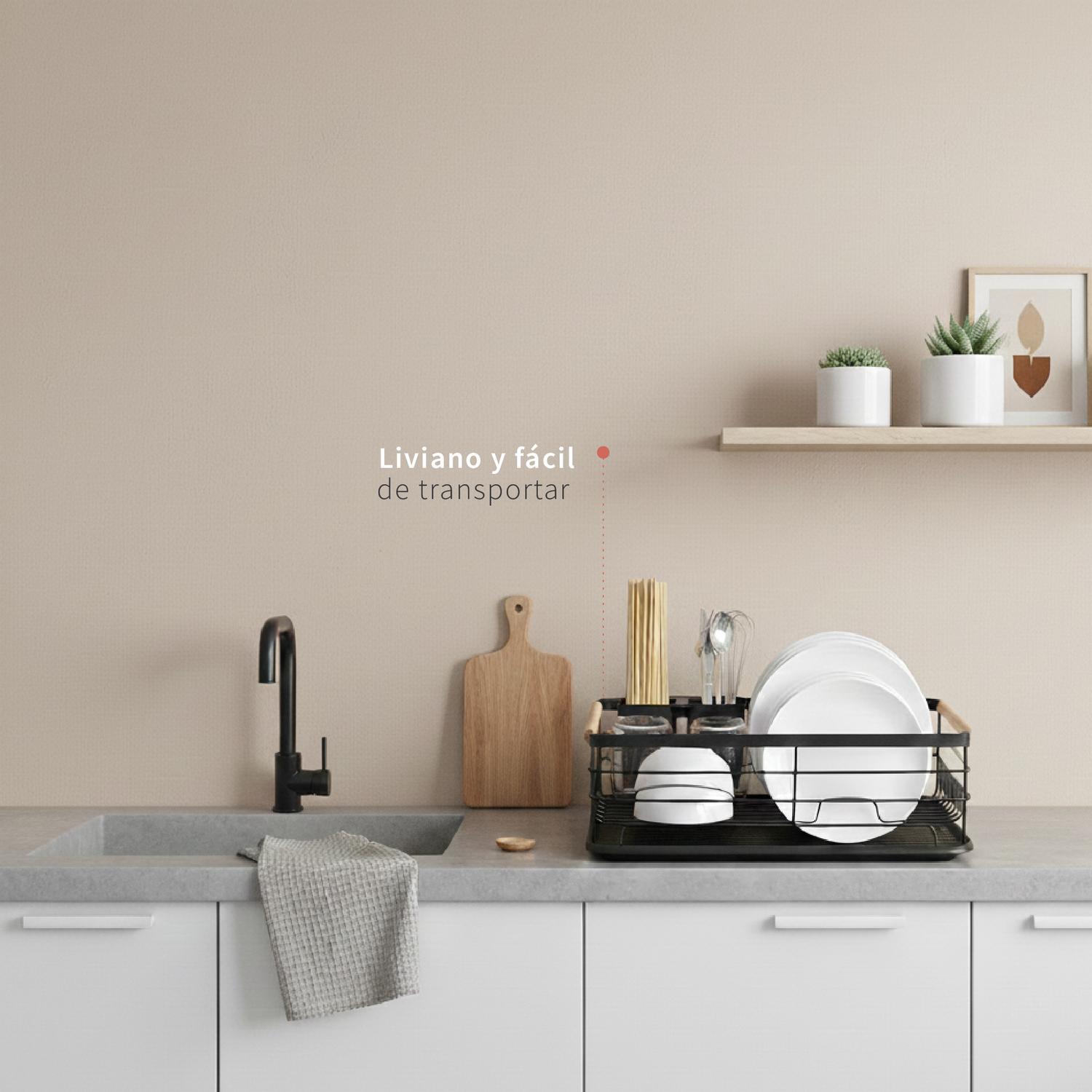Cuenta con una bandeja inferior de drenaje y un contenedor doble para separar tus cubiertos.