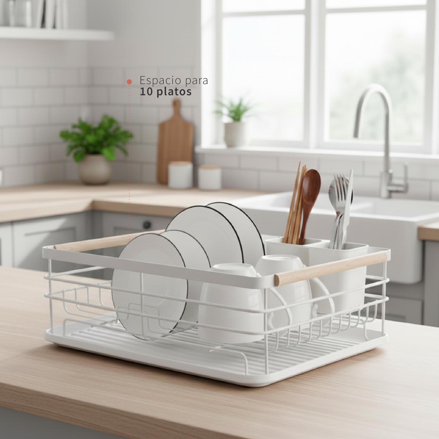 Con nuestro Secaplatos el espacio en tu cocina ya no es un problema. Es compacto, pero de gran capacidad, te permite ordenar 10 platos más vasos o bowls.