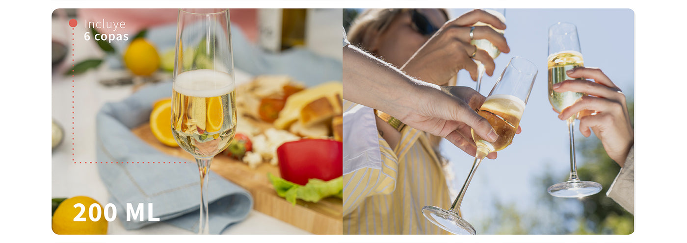 • Uso: Perfecto para espumantes, champaña, prosecco y cócteles ligeros.