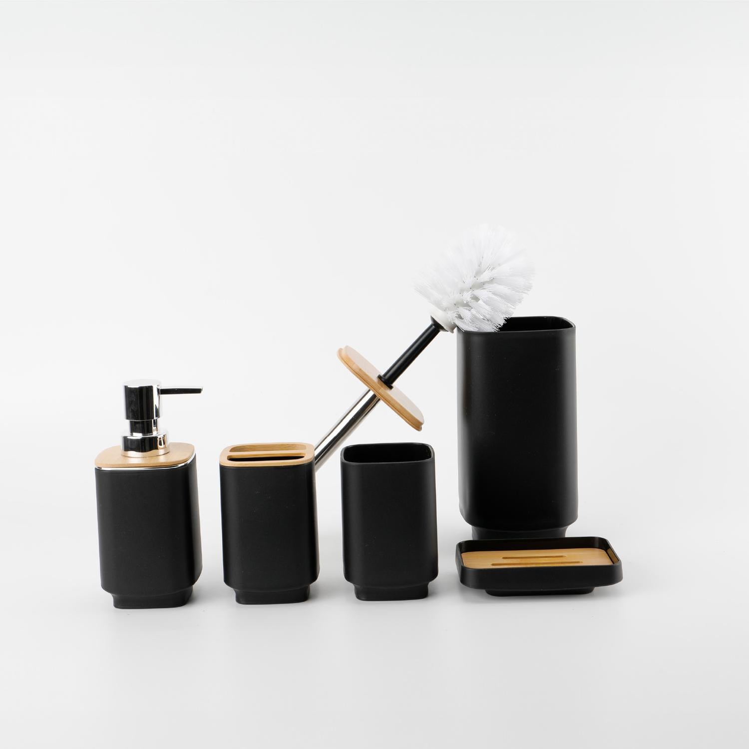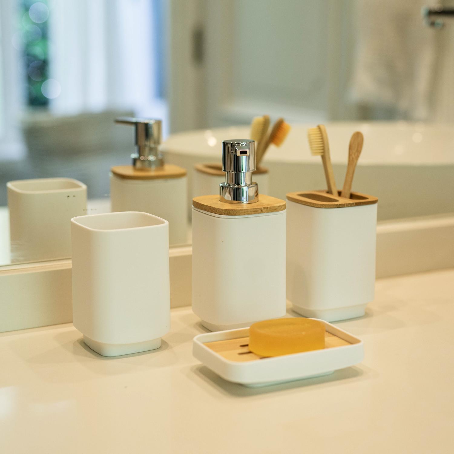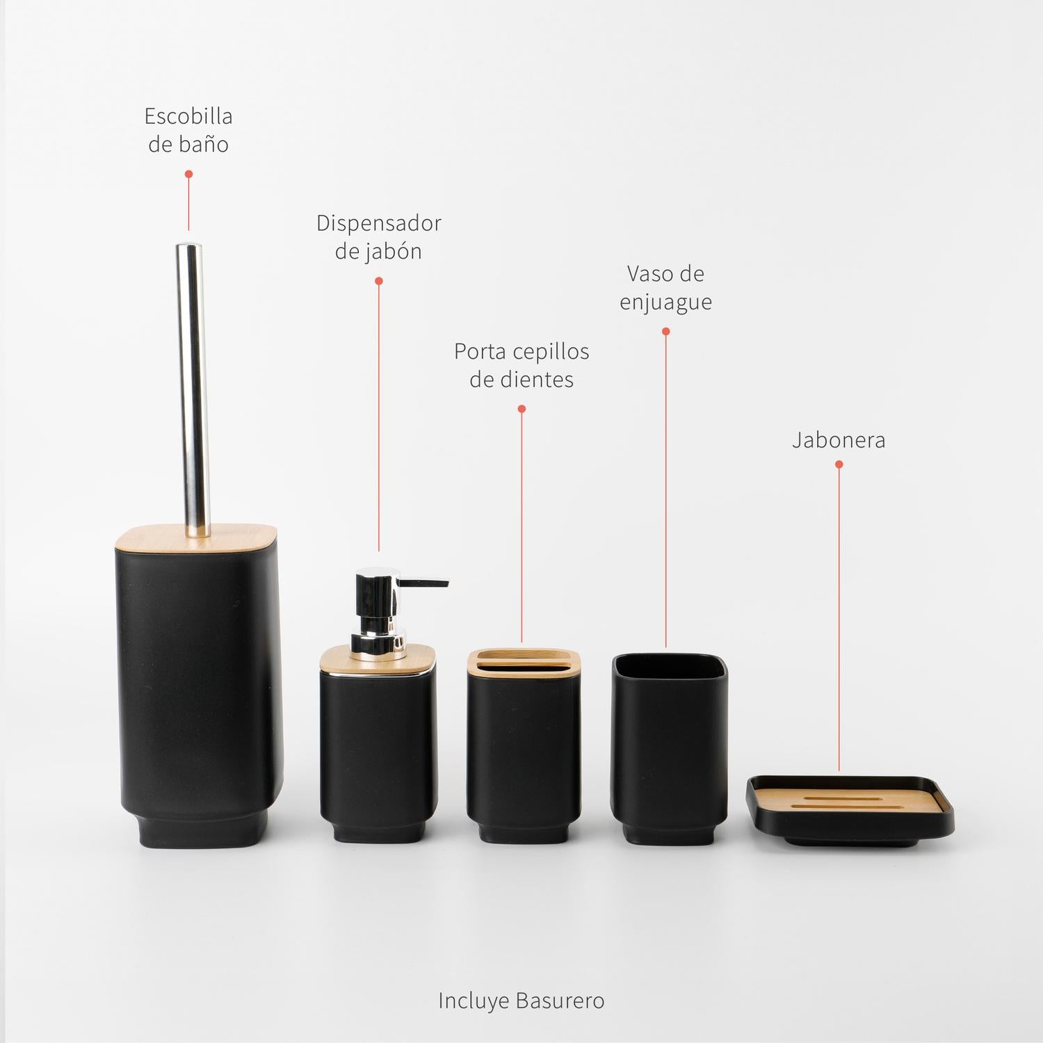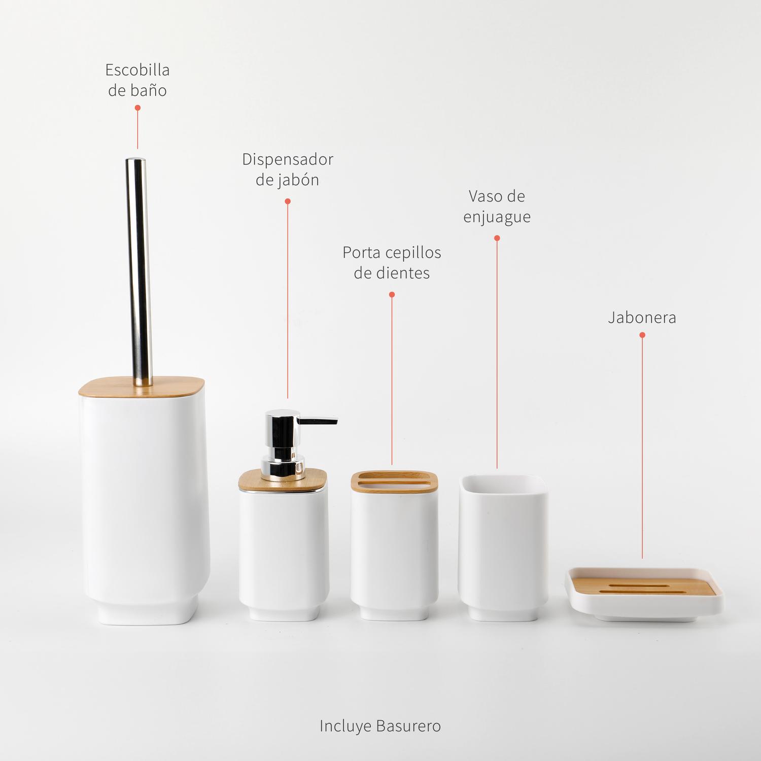 • Incluye: Basurero, cepillo de baño, dispensador de jabón líquido, vaso, vaso para cepillos y jabonera