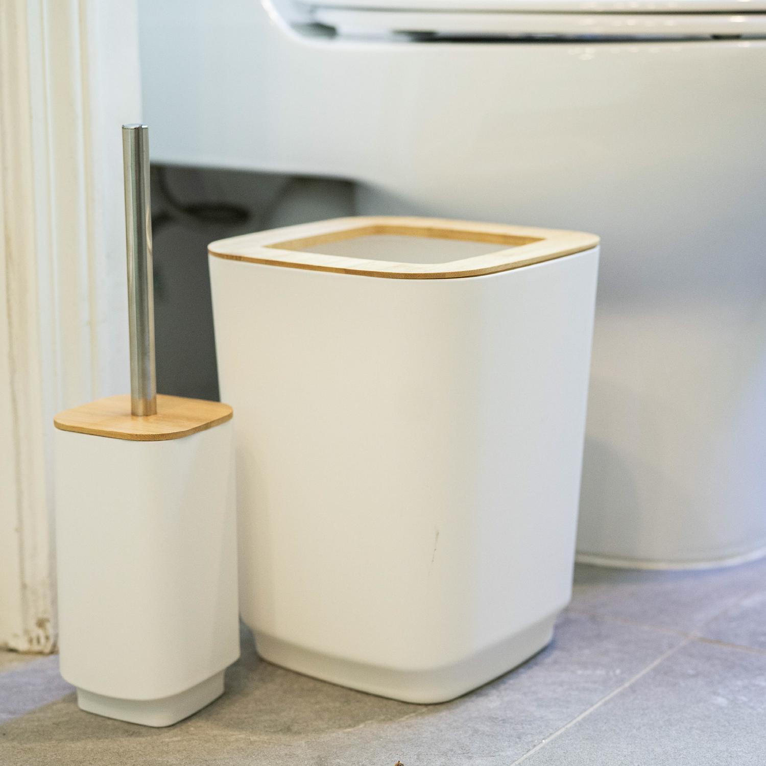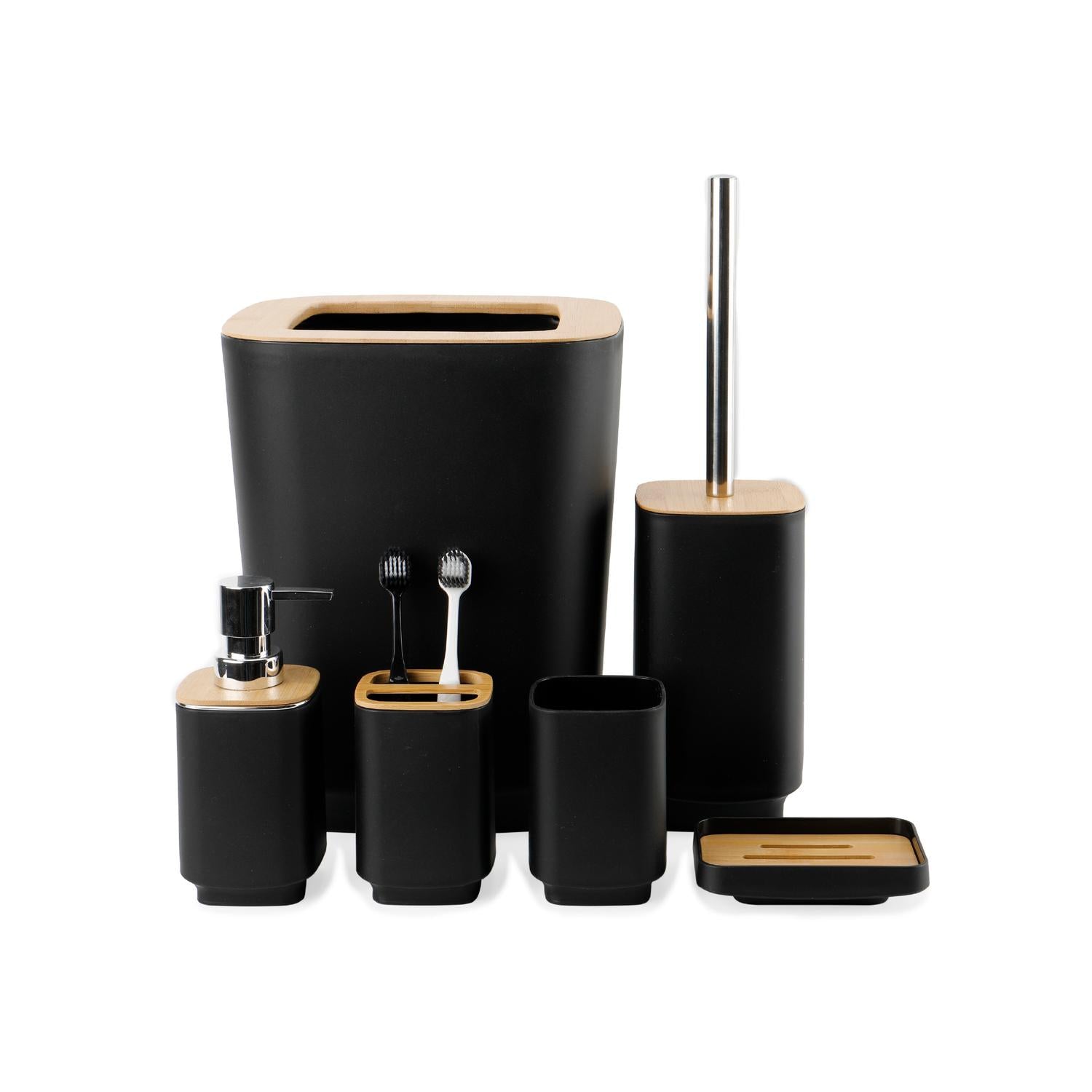 El set incluye todo lo que necesitas para mantener tu baño organizado y sofisticado: 1 basurero, 1 cepillo de baño, 1 dispensador de jabón líquido, 1 vaso, 1 vaso para cepillos y 1 jabonera. El contraste entre el bambú natural y el acabado moderno del PP aporta una sensación cálida y minimalista, integrándose a la perfección en cualquier tipo de decoración.
