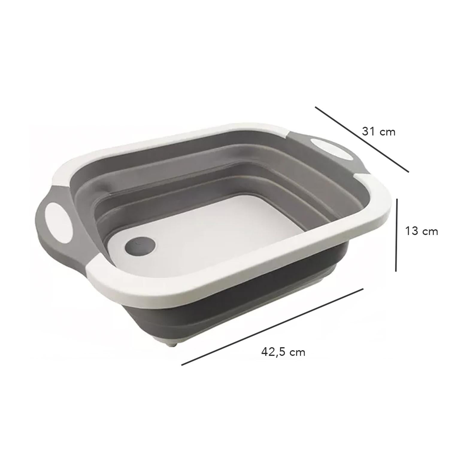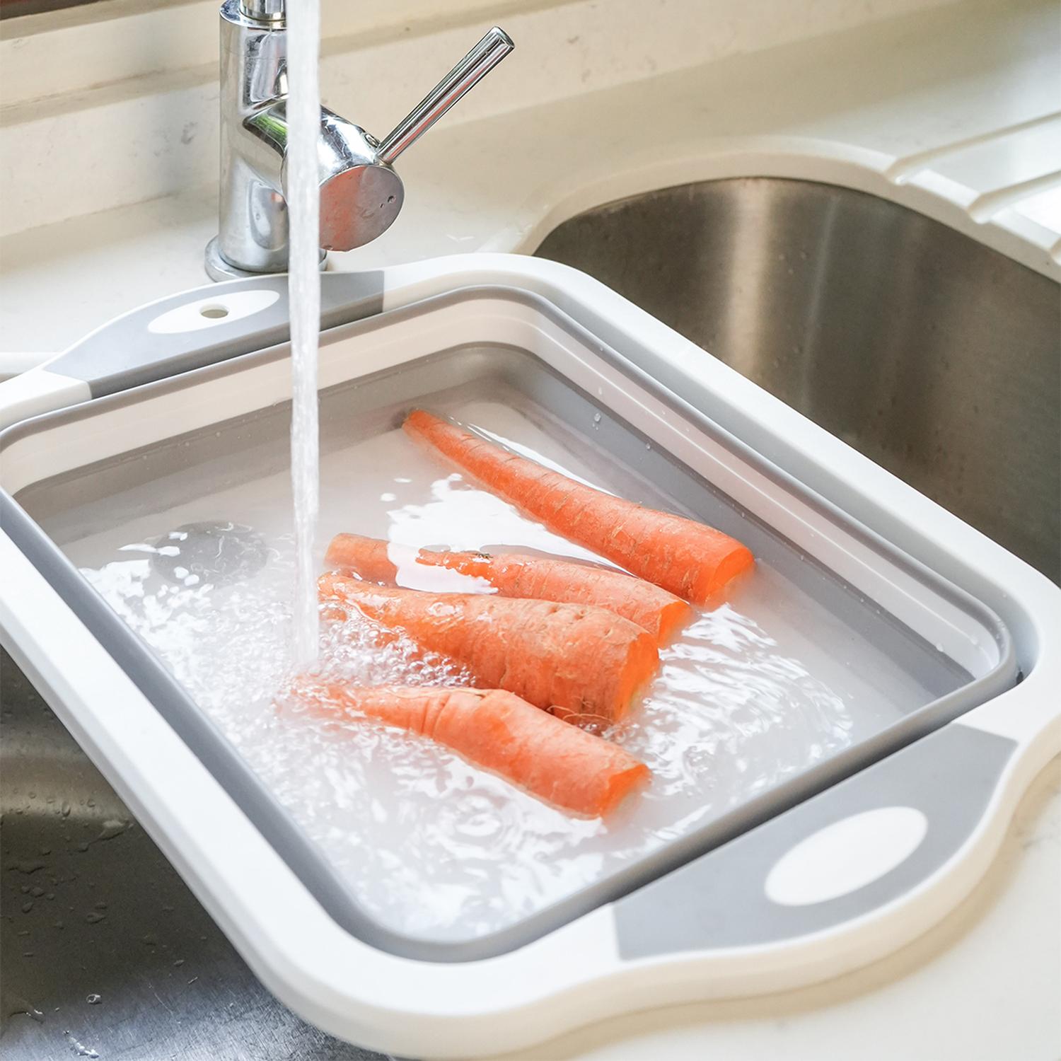 Tabla, colador y contenedor todo en uno. Corta tus verduras, despliega la tabla, lava tus verduras y luego al abrir el drenaje se bota el agua del lavado. ¿Más fácil? Imposible.