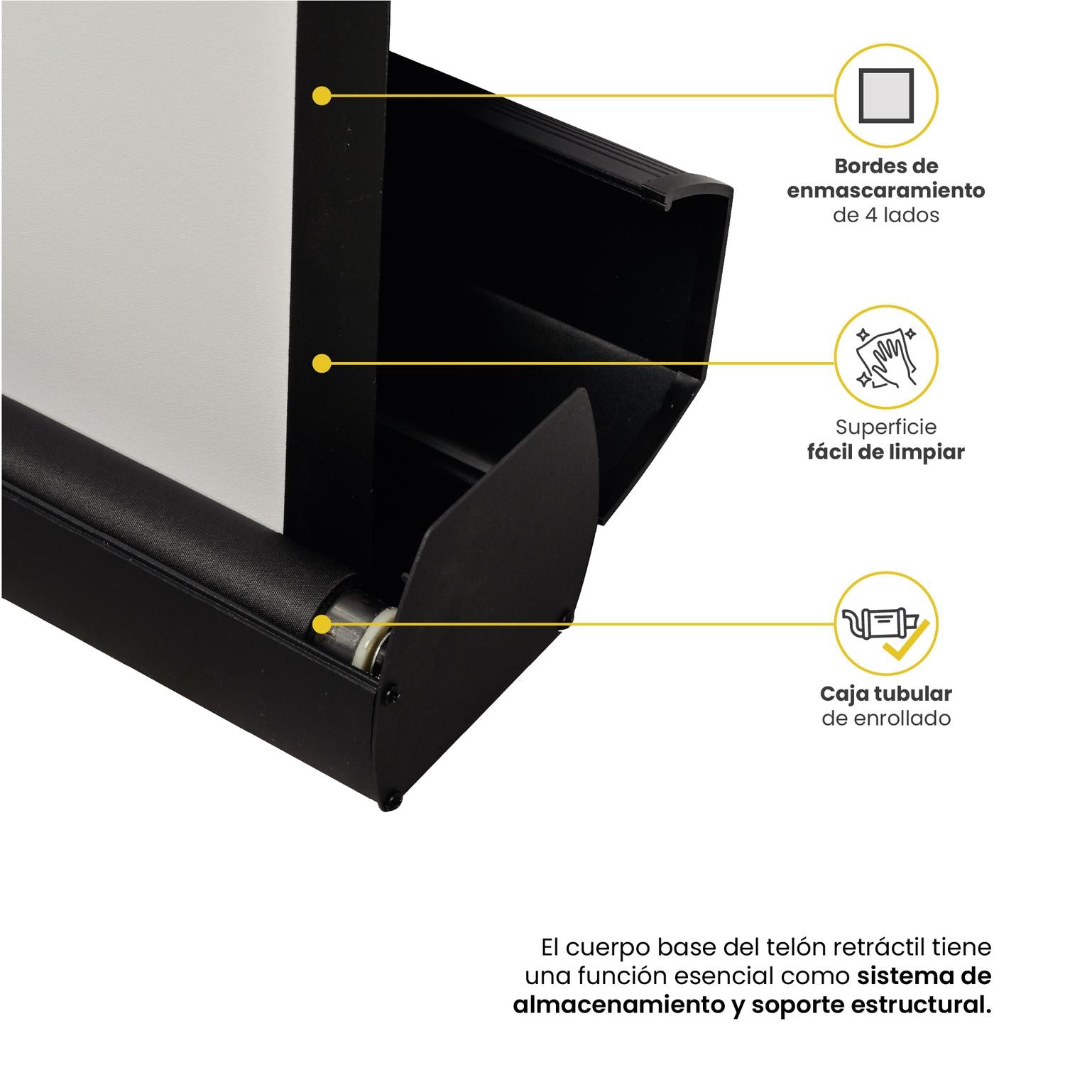 Una vez plegado, el telón se guarda dentro de una caja tubular metálica, que protege la pantalla contra golpes, polvo y humedad. Ideal para presentaciones, proyecciones en casa, eventos o noches de película al aire libre.
